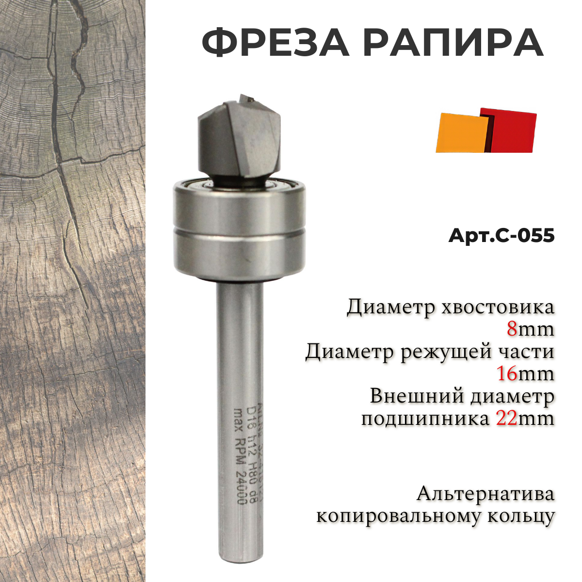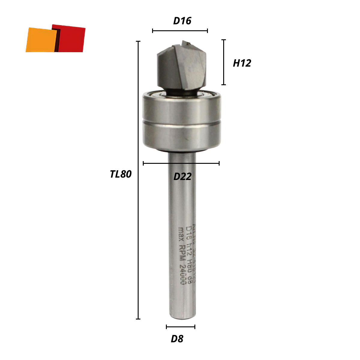 Фреза с отрицательным углом наклона ножей с двумя подшипниками D16 H12 TL80 d8 мм